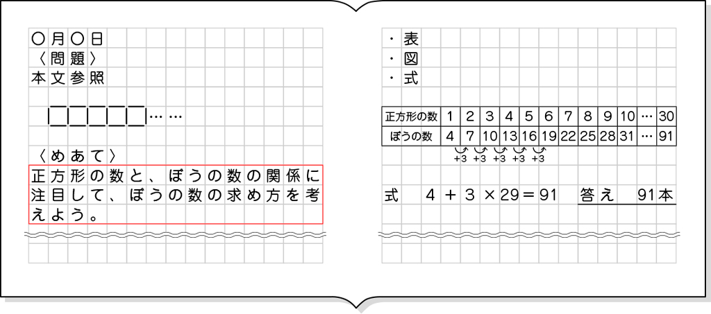 そこで本時の学習では、正方形の数が1増えると、棒の数がいくつ増えるのかということについて、表や図に整理しての変化の様子を捉えることにより、既習の2つの数量の関係の考察の仕方について帰着して考えていきましょう。まず、伴って変わる2つの数量が何と何であるのか見いだすことを大切にします。表を用いる際にも、項目についてよく考え、それぞれの数量を明らかにして数量の変化や対応の特徴に目を向けていくようにしていき、□や〇を用いた式に表し、一方の数量が大きくなったときでも、もう一方の数量を計算で簡単に求めることができるよさにも気づかせます。その後、正方形の数を50個の問題を同様に考え、すべての子供が概ね正しく立式できるようにしましょう。