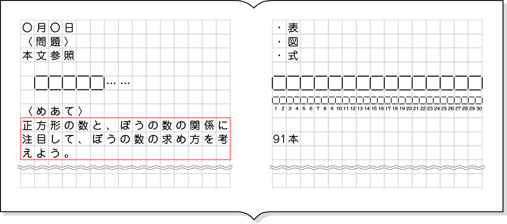 ・□が30個のときの図をかいて、1本ずつ数えて求めている。