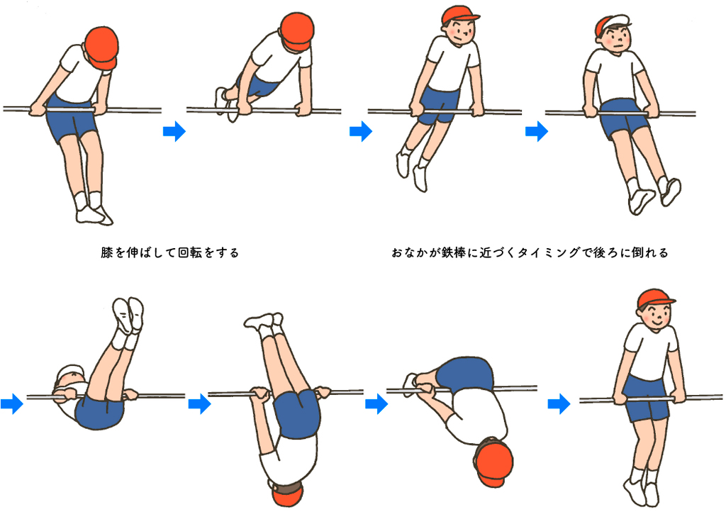 足を鉄棒よりも高く振ることができてきたら、おなかが鉄棒に当たるタイミングで後方に倒れ込みます。このタイミングが合えば、一人で回転することができます。タイミングをつかめるように繰り返し練習しましょう。成功しない場合は、一人で挑戦することとお手伝いで回ることを交互にしていきましょう。