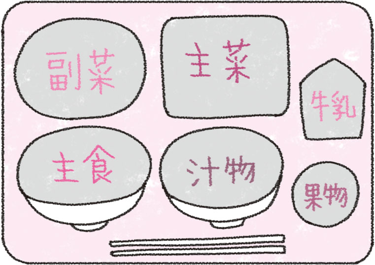 基本的な給食の構成は、主食・汁物・主菜・副菜・牛乳となっています。配膳の際は、メニューにもよりますが、食器の並べ方も教えておきましょう。