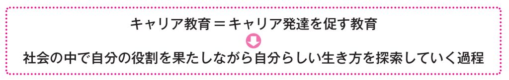 キャリア教育は「一人一人の社会的・職業的自立に向け、必要な基盤となる能力や態度を育てることを通してキャリア発達を促す教育」(2011 年中教審答申)と定義されています。ここでいうキャリア発達とは「発達とは、生涯にわたる変化の過程であり、人が環境に適応する能力を獲得していく過程である。その中で、キャリア発達とは、自己の知的、身体的、情緒的、社会的な特徴を一人一人の生き方として統合していく過程」(2004 年・文科省「研究協力者会議報告書」)とされています。