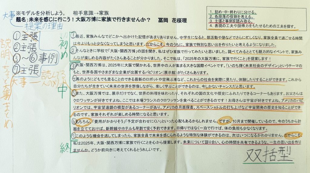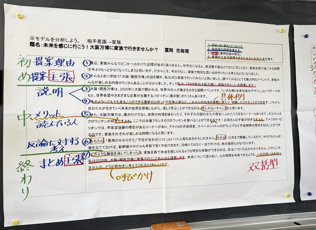 研究授業の単元は、「構成を考えて、提案する文章を書こう〜未来を変える!? ぼくの、わたしの提案書〜」。全7時間の4時です。