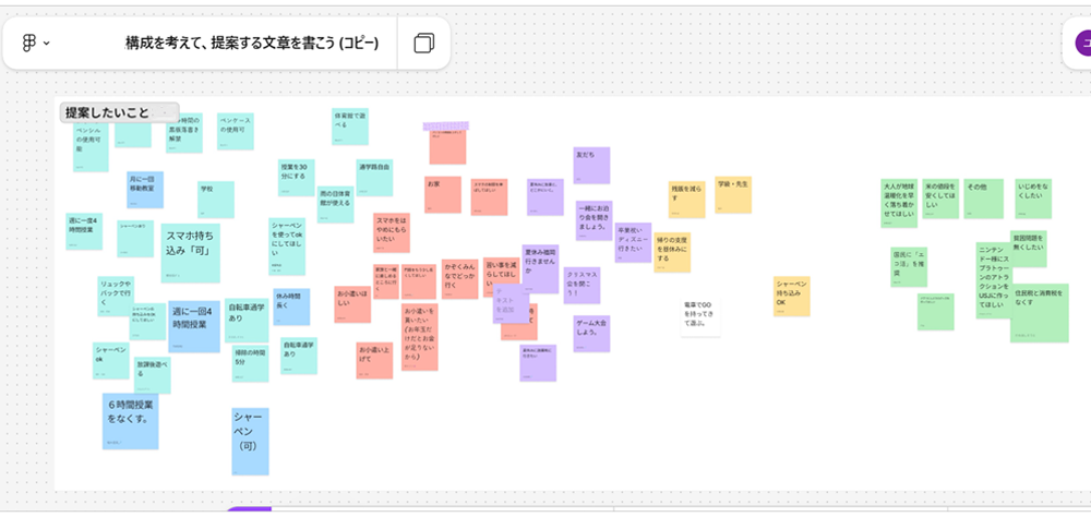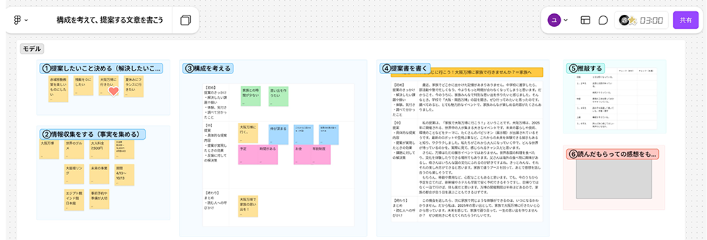 その後、子供たちは解決したい課題や提案内容、提案する相手を決め、学習計画を立てて進めていきます。また、提案書を書くまでのモデルの過程がフィグジャム上にサンプルとしてアップされており、子供たちはそれを参考にしながら提案書に取り組みます。