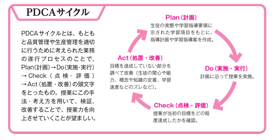 注意点:年間指導計画の作成では、大単元や中単元を指導する順番に選び出して配列し、時間配分を行います。節目(各学期など)ごとに実施状況や到達度の中間評価を行い、PDCA サイクルで計画を修正することも重要です(下記参照)。