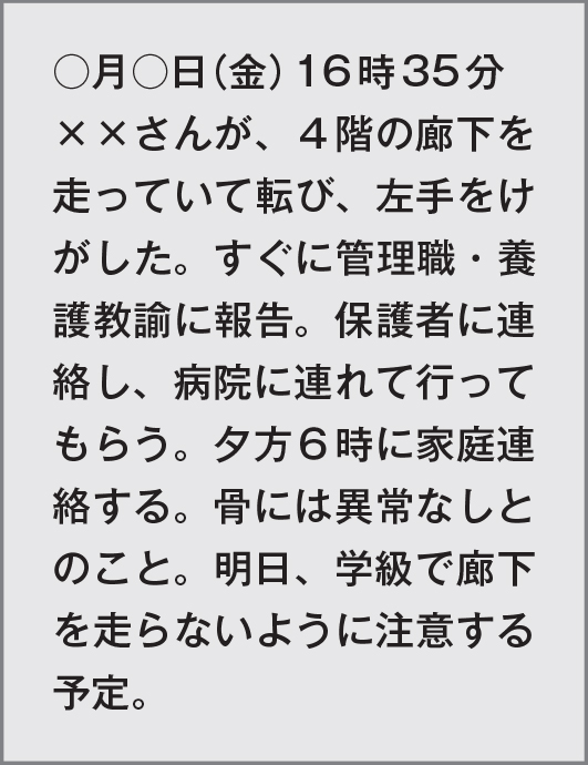2.いわゆる「5W 1H」の「いつ」「どこで」「誰が」「何を」「なぜ」「どのように」が分かるように記録します。