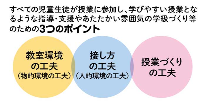 大切なのは、学級に在籍している子供の姿をもとに、どのような環境設定をしておくと落ち着いて取り組めそうか、教材をどのように提示するとより興味関心をもって取り組めるのか、考えたことを表現するためには、どのような表出方法にすると表現しやすいのか、どのようにしたら他者とともに学び合えるのかなど、子供の姿に立ち戻って考えるということです。今回は、「①教室環境の工夫(物的環境の工夫)」、「②接し方の工夫(人的環境の工夫)」、「③授業づくりの工夫」の3つのポイントで紹介します。