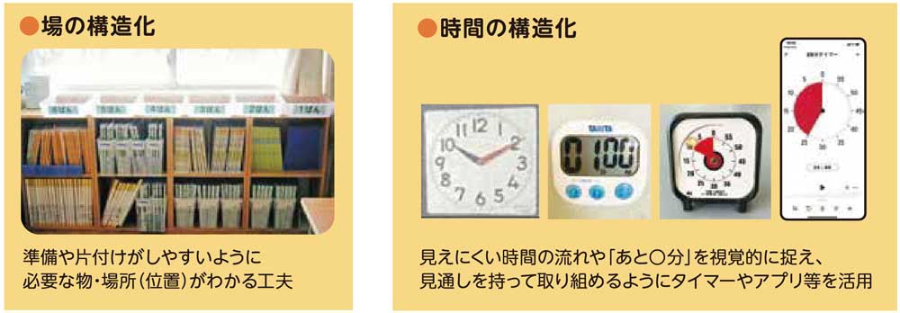 また、次にすることが分からず不安になる子供や、学習の流れの説明を聞いてもその内容を記憶に留めることが得意でない子供もいます。そのような場合、取り組むべきことにより集中できるよう、また、学習に見通しをもって取り組めるよう、学習の流れや目標(頑張りポイント)を視覚的に提示することも有効です。視覚的に見て分かる手がかりを提示しておくことで、子供が自らその手がかりを活用できるようにしていくことも大切です。