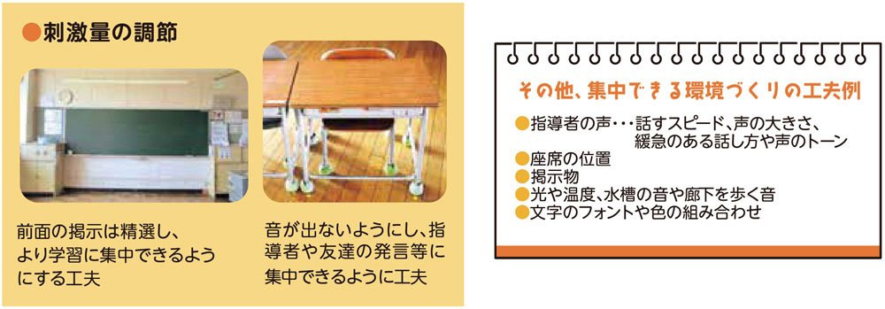 例えば、音に敏感な子供や周りの刺激に敏感に反応して行動してしまう子供がいる場合、教室前面の視覚からの情報を精選し、注目してほしい学習内容に意識が向くように環境を整えたり、刺激量を調節したりすることが必要です。