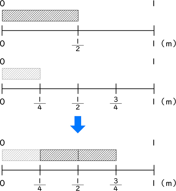 図を見たら、[MATH]\(\frac{1}{2}\)[/MATH]mと[MATH]\(\frac{2}{4}\)[/MATH]mは等しい大きさだから、[MATH]\(\frac{1}{2}\)[/MATH]mは[MATH]\(\frac{2}{4}\)[/MATH]mに変えてもいいんじゃない。