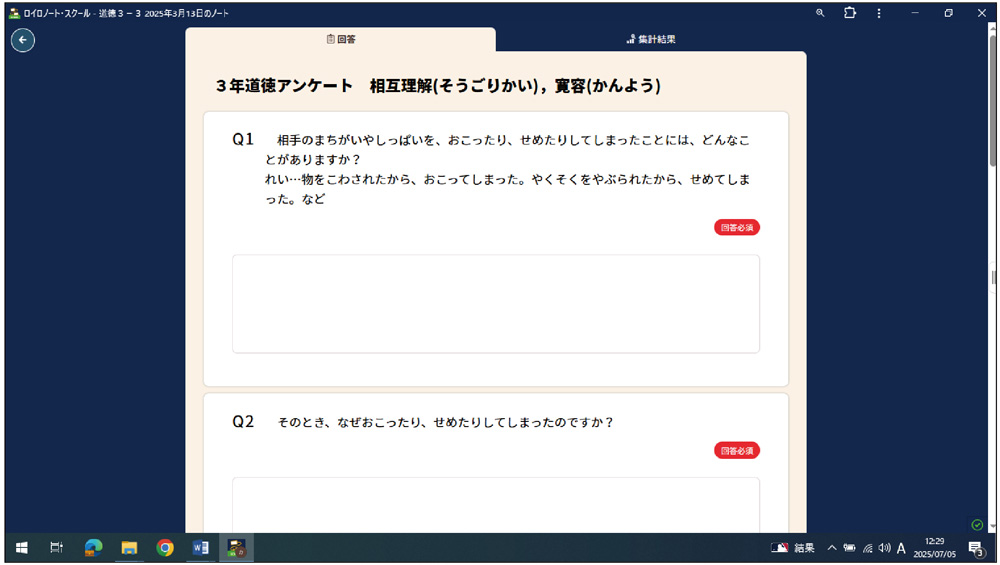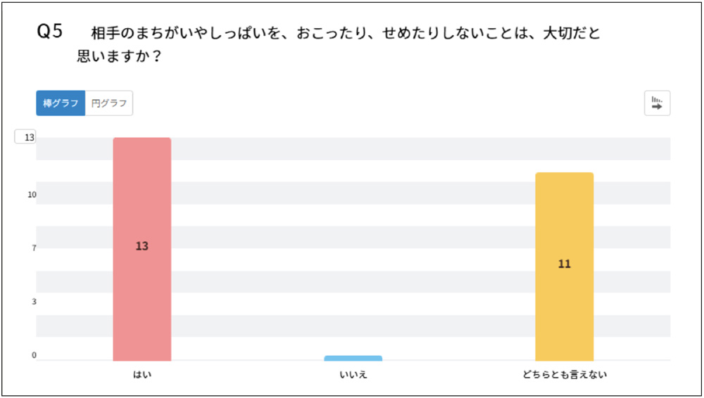 質問項目には、「物を壊されてしまったり、約束をやぶられてしまったりしたときなど」と、場面を例示することで、自分の生活経験を想起しやすくしました。また、6年間を通して、クラウド上で蓄積していくことを考え、アンケート機能で「自分シート」を作成しました。デジタル学習基盤を活用したポートフォリオにすることで、同じ内容項目ごとに整理し、考え方の変容を確認することも容易になりました。さらに、アンケート結果をグラフにすることで、学級の現状を視覚的に把握することができるようにしました。