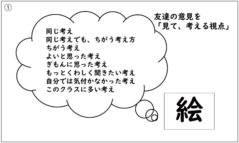 ①「見て、考える視点」のカードは、ロイロノートにより集約された意見をじっくり見て、考える際に活用します。自分と共通・類似する考えからは、自分の考えがより強固になったのか、付け加わったのかなどを自覚したり、自分と相違する考えからは、新たな考え方を獲得したのか、自分の考え方が変わったのかを自覚したりします。さらには、友達はなぜそのように考えたのか疑問を引き出すことができると考えました。