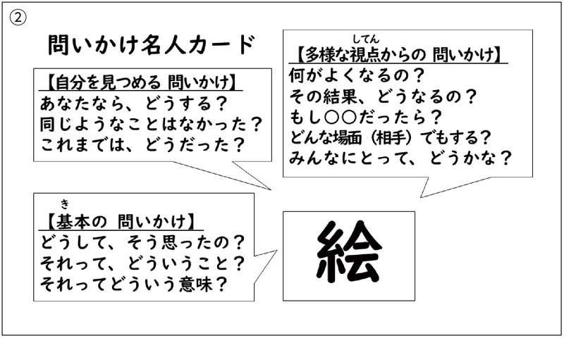 ②「問いかけ名人カード」は、ペアやグループでの話合い、全体発表の際に活用します。対話活動の活性化につながるだけでなく、自分の考えを深め広げたり、新たな考えを生み出したりすることができると考えました。