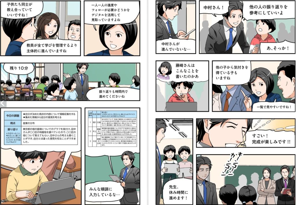 デジタルブック『デジタルを活用したこれからの学び TOKYO LEARNING STYLE』では、授業中の「振り返り」の場面をまんがで紹介。デジタルを活用して互いの学びを共有し合う、子供たちや先生の姿が描かれています。