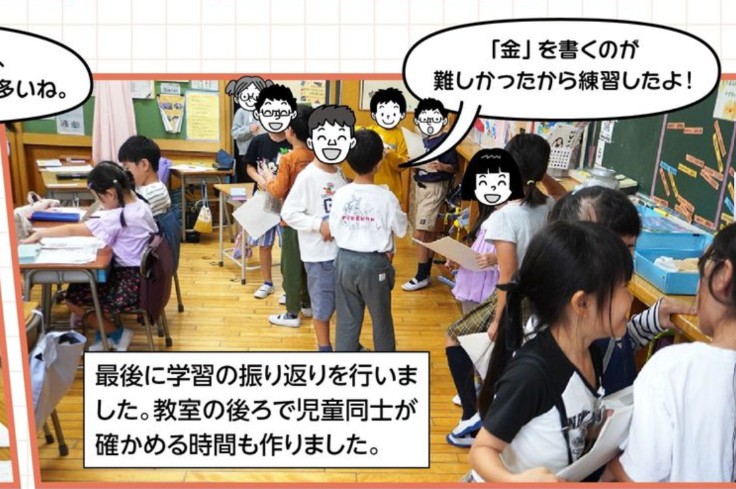 低学年の漢字練習の授業における振り返りでは、子供たちがお互いの学びを見せ合いながら確認し合う時間を設けています。「できたこと」「わかったこと」を自分の言葉で友達に伝えることで、自分の学びを確かめながら表現する力を育てています。