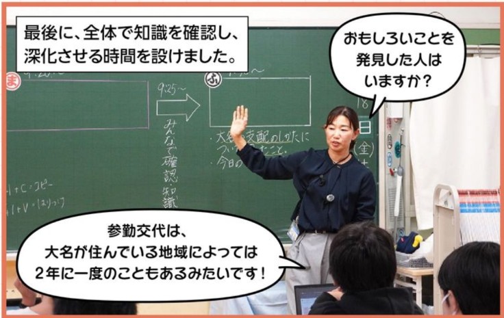 「江戸幕府がどのようにして大名を支配したのか」について調べたあと、振り返りの時間を学級全体での知識共有に充てました。子供たちは、自分の学びを発表し合うことで、他者の学び方や考え方を参考にしながら理解を深める仕組み作りが行われています。