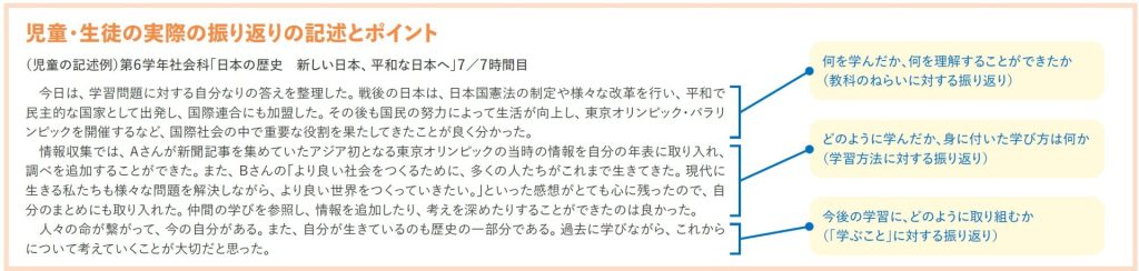 子供たちがよりよい振り返りができるよう、教師が、「どのような視点で振り返りに取り組めば、次の学びにつながるか」という、《振り返りの視点》を示すことが大切です。