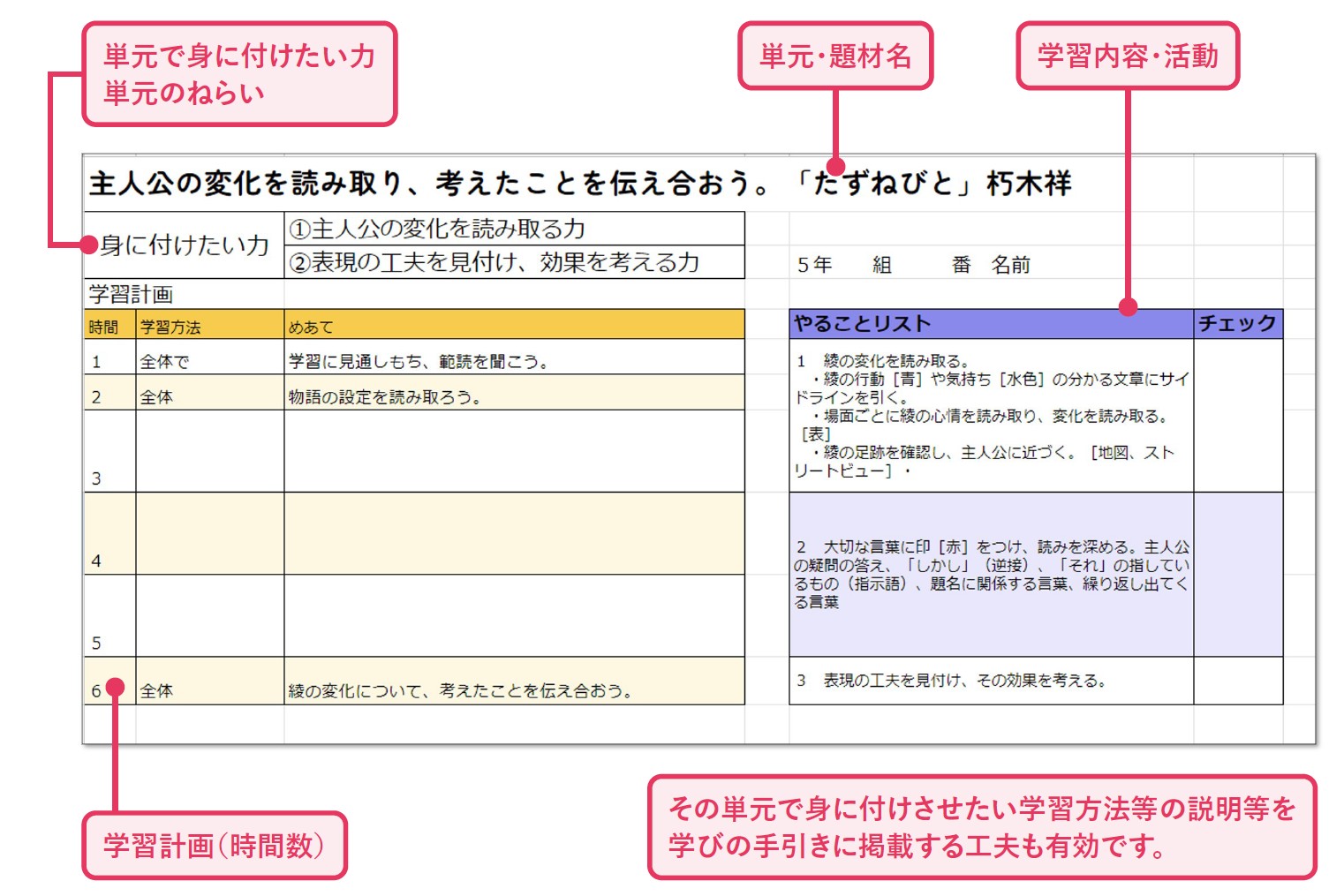 「学習計画表」は、単元の学習の内容や方法、時間の使い方などを見通しながら整理し、自分の学びを計画的に進めるためのツールです。「学びの手引」と組み合わせて活用することで、子供たちは「何を、どのように学ぶのか」を自分で考え、計画に沿って学習を進められるようになります。