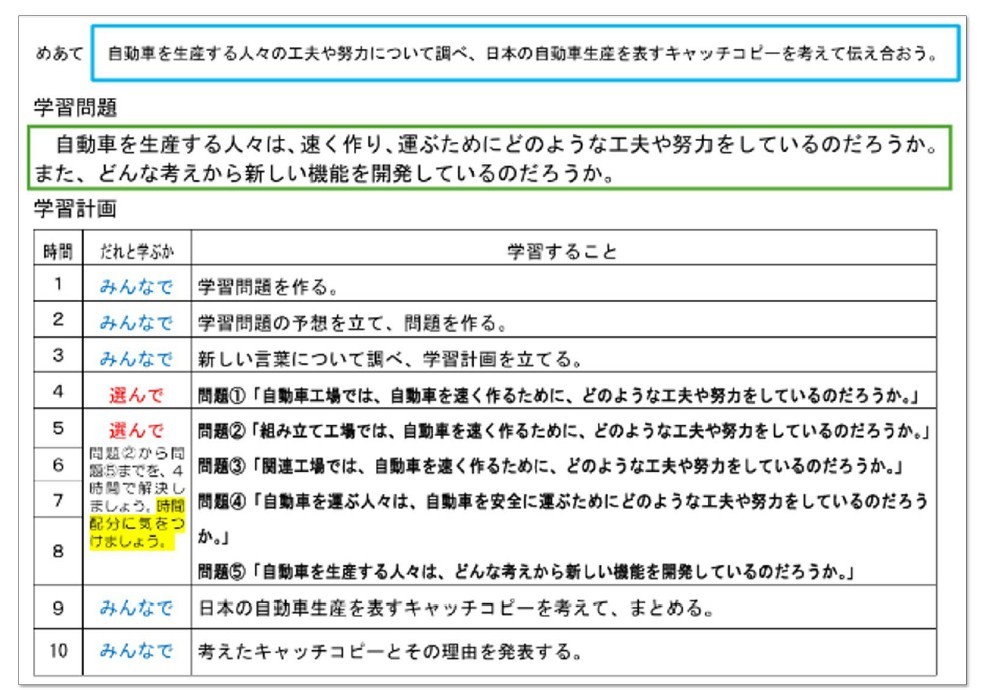 作成するときは、まず学習問題を明確に提示し、そのうえで学習内容や流れ、方法、協働する相手など、単元や育てたい力に応じた項目を設定します。「今日の授業で何をめざすのか」「どんな力を伸ばしたいのか」が一目でわかるようにすることが大切です。