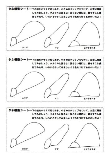 薄い翼を持った種子の実物を見ると共に、『タネ模型シート』(下のボタンを押すとダウンロードページに遷移します)をハサミで切り取り、タネの代わりにおもりとして、クリップを付けてタネの飛ばしてみましょう。