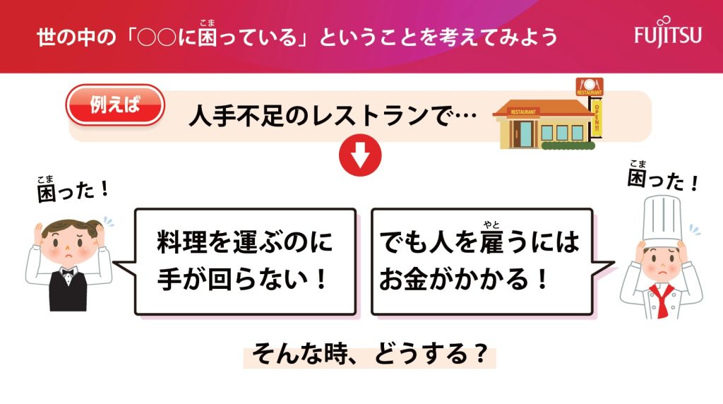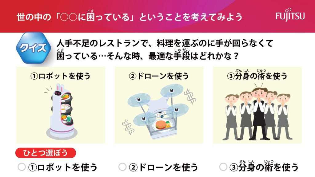 「富士通」とのコラボ教材「テクノロジーで課題を解決しよう」は2時間構成の授業用コンテンツで、1時間目ではまず、災害現場やレストラン、駅、漁港など、テクノロジーが活躍しているさまざまな場面を例に、楽しい参加型クイズをまじえながら学ぶことができます。