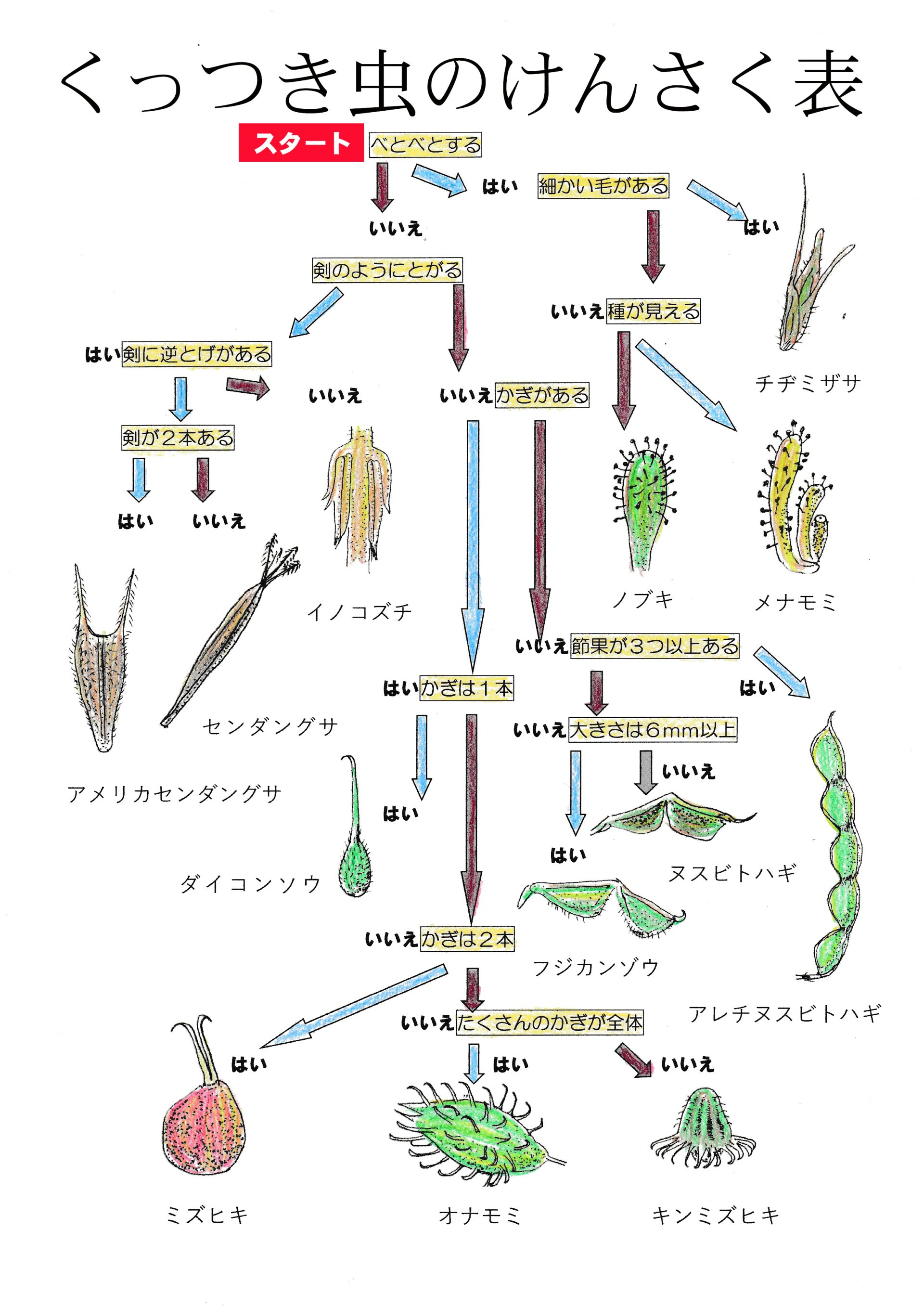 くっつき虫が大好きな子どもはたくさんいますので、見つけたくっつき虫がなんという植物のタネなのか見分けるための検索表を作りました。ぜひご活用ください!