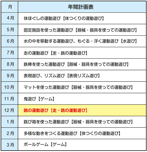 跳の運動遊びは、助走を付けて片足で踏み切り、前方や上方に跳んだり、片足や両足で連続して跳んだりする楽しさに触れることができる運動遊びです。
