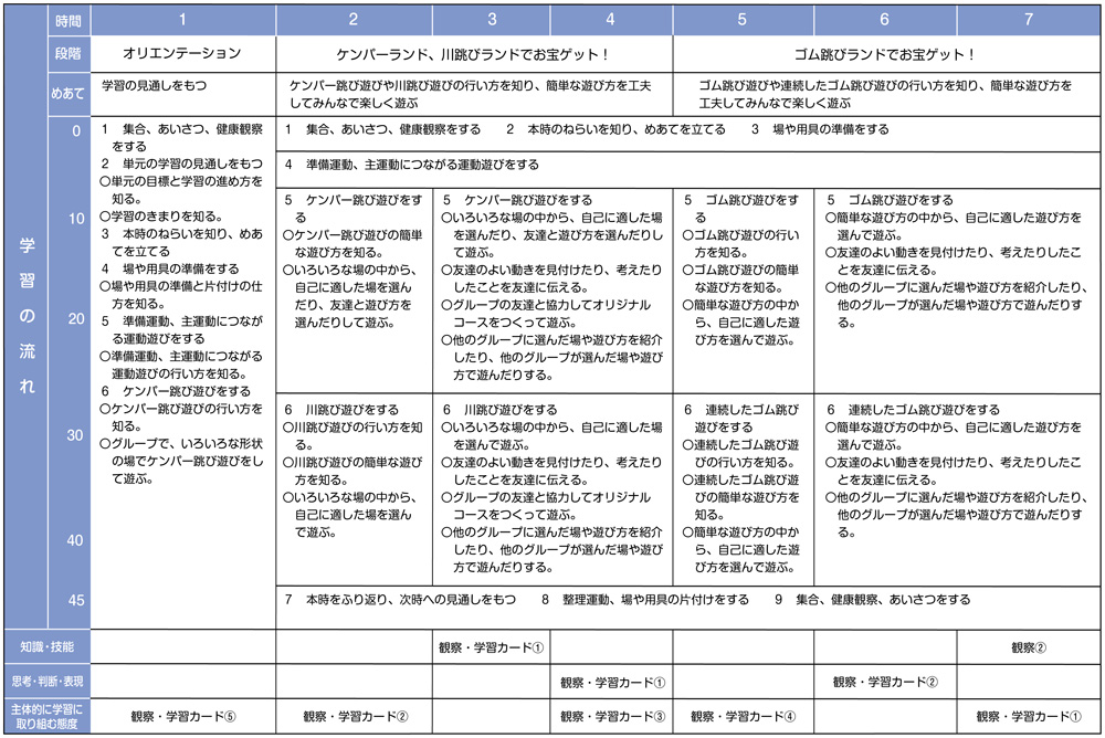 単元前半は前方に跳ぶケンパー跳び遊びや幅跳び遊びをして遊ぶ時間、単元後半は上方に跳ぶゴム跳び遊びをして遊ぶ時間を設定することで、それぞれの運動遊びの行い方を知りながら、前方への跳び方と上方への跳び方を身に付けて楽しく遊ぶことができる授業を展開します。学校の年間指導計画などをふまえ、今回紹介した単元の前半と後半を分けて、時期を離して実施することも可能です。