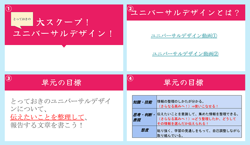 「最初に『ユニバーサルデザインって何だろう?』というところをしっかり押さえるようにしました」と内川教諭。そのうえで、身の回りにあるとっておきのユニバーサルデザインを紹介し、学びへの関心を高めていきました。