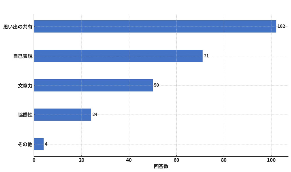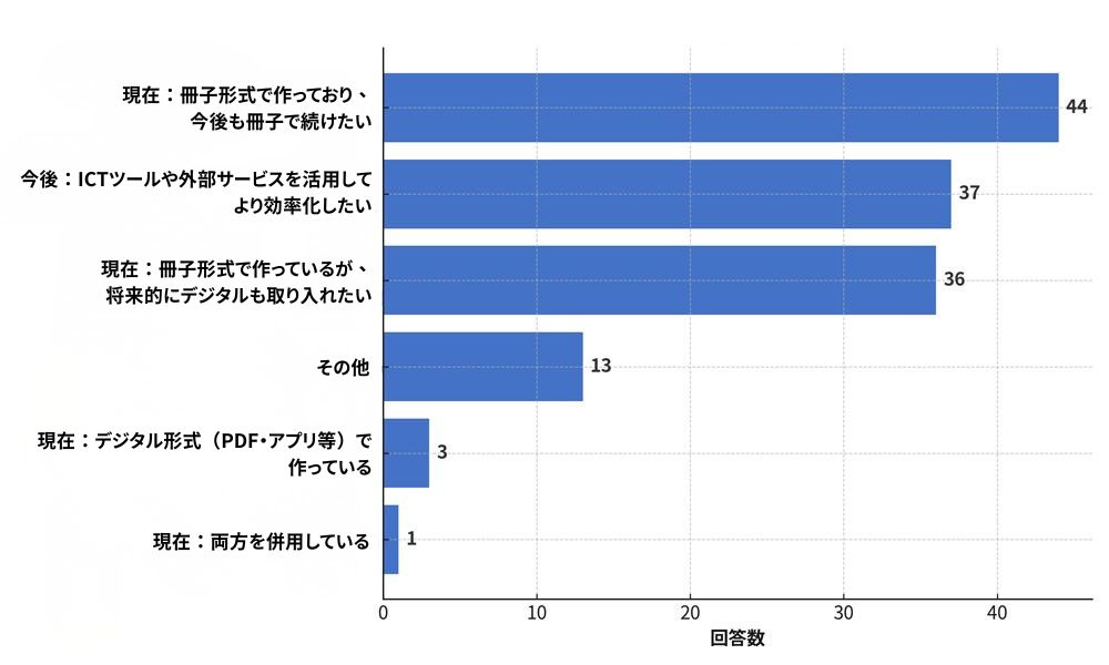 この回答からも分かるように、卒業文集の主流は圧倒的に「冊子形式」であり、形として手元に残すことに価値があるという意見が根強いようです。一方、「冊子形式を継続したい」(44人)が最多でありながら、今後は「デジタル化」「効率化」に強い関心を持つ層が多いこともうかがえます。