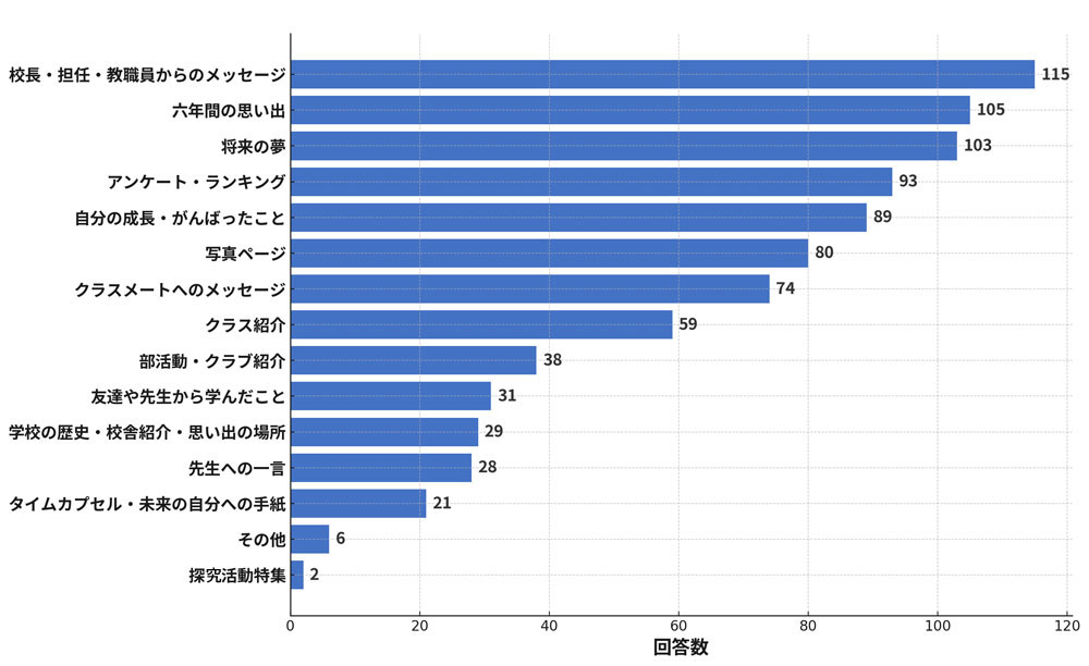 「先生からのメッセージ」が1位。次いで「六年間の思い出」や「将来の夢」