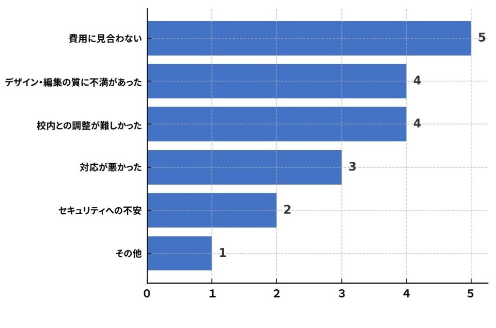反対に外部委託に不満のある回答理由で最多が「費用に見合わない」と、サービスとコストパフォーマンスに対して十分ではないと考えているようです。このほか、編集作業の仕上がりが期待値を下回っていたことや、校内での意思決定プロセスに負担があったことなどが挙げられました。その他の意見では、「外部委託といっても、校正や編集は教員が行うので、そんなに楽ではない」という声も。