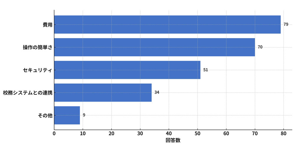効率化をはかるにあたり、重視する点で最も多かったのが「費用」。次いで「操作の簡単さ」「セキュリティ」という結果でした。毎年継続させるためにも、費用対効果のある外部サービスやICTツールの選択には慎重なようです。