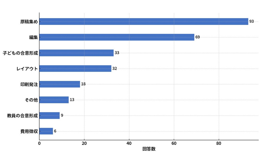 この問いでは、子どもたちから原稿を集めるという作業工程がいちばん大変という声が多く挙がりました。さらに、その原稿を校正し、不備があれば子どもに修正させる、そして保護者への確認と、いくつものステップを踏まざるを得ないことに苦労しているようです。このほか、掲載写真に偏りがないか、見栄えをよくするためのレイアウト作業にも注力していることが分かります。