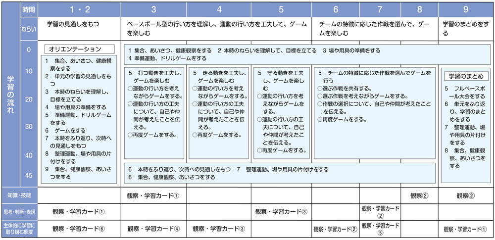 ベースボール型におけるボール操作やボールを持たないときの動きを身に付けるとともに、ルールを工夫したり、チームの特徴に応じた作戦を選んだりすることができるようにします。また、ゲームに積極的に取り組み、ルールを守り助け合って運動をしたり、勝敗を受け入れたり、仲間の考えや取組を認めたり、場や用具の安全に気を配ったりすることができるようにします。