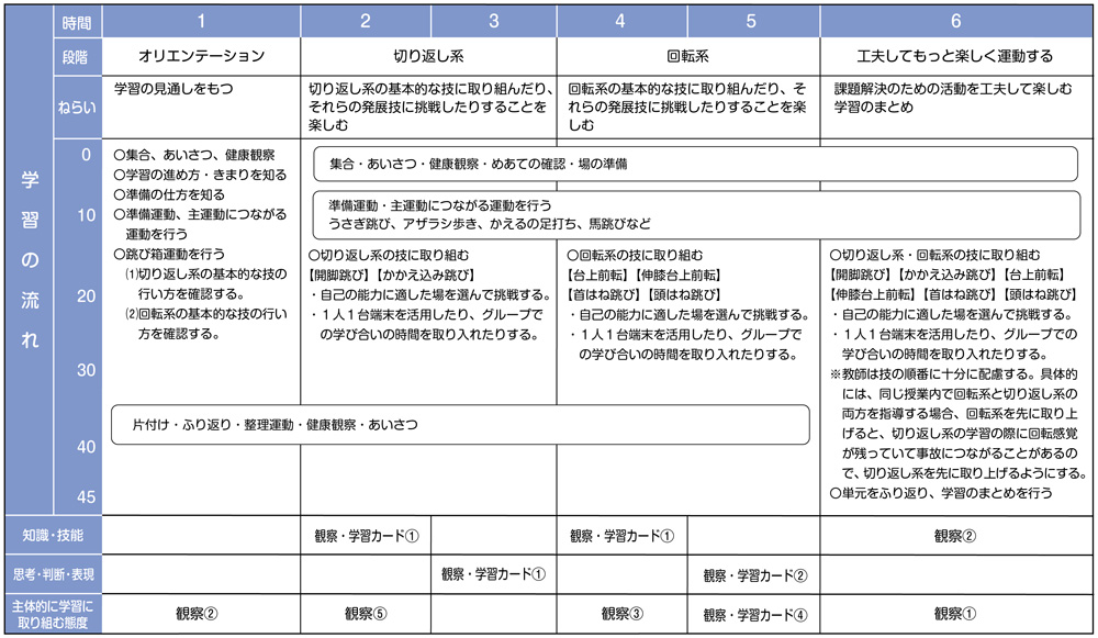 自己の能力に適した切り返し系(開脚跳びなど)や回転系(台上前転など)の基本的な技や、基本的な技に十分に取り組んだ上で、それらの発展技に取り組むことができるようにします。