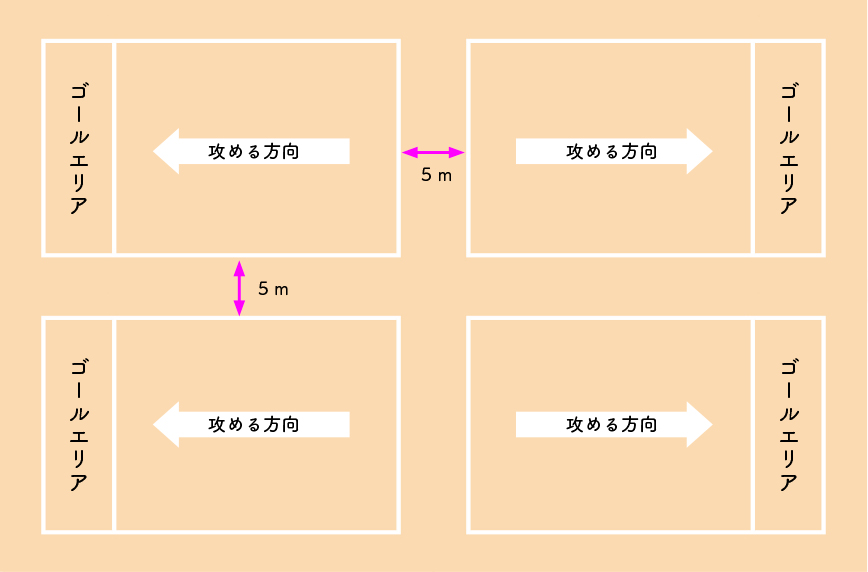 1つのコートが広いので、学校によっては数コートを横並びに設置することが難しい場合があります。その場合は、下図のように設置する方法もあります。攻める方向が重ならないようにしたり、コート間の距離を十分にとったりして、安全に活動できるようにしましょう(図では、コート間の距離を5mとして考えています)。
