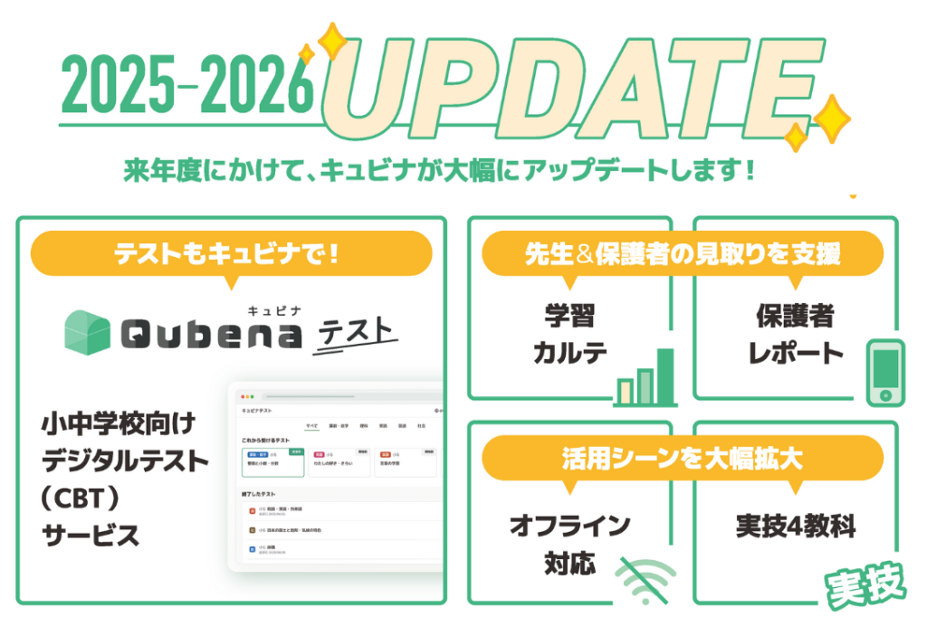 子どもたちの「個別最適で主体的な学び」を実現するためのツールとして学校現場での利用が広がっている学習eポータル+AI型教材「キュビナ」の機能アップデートや活用アイデア、新たなCBTサービス「キュビナ テスト」などの最新情報、企業と連携した探究学習プログラム等についても説明があります。