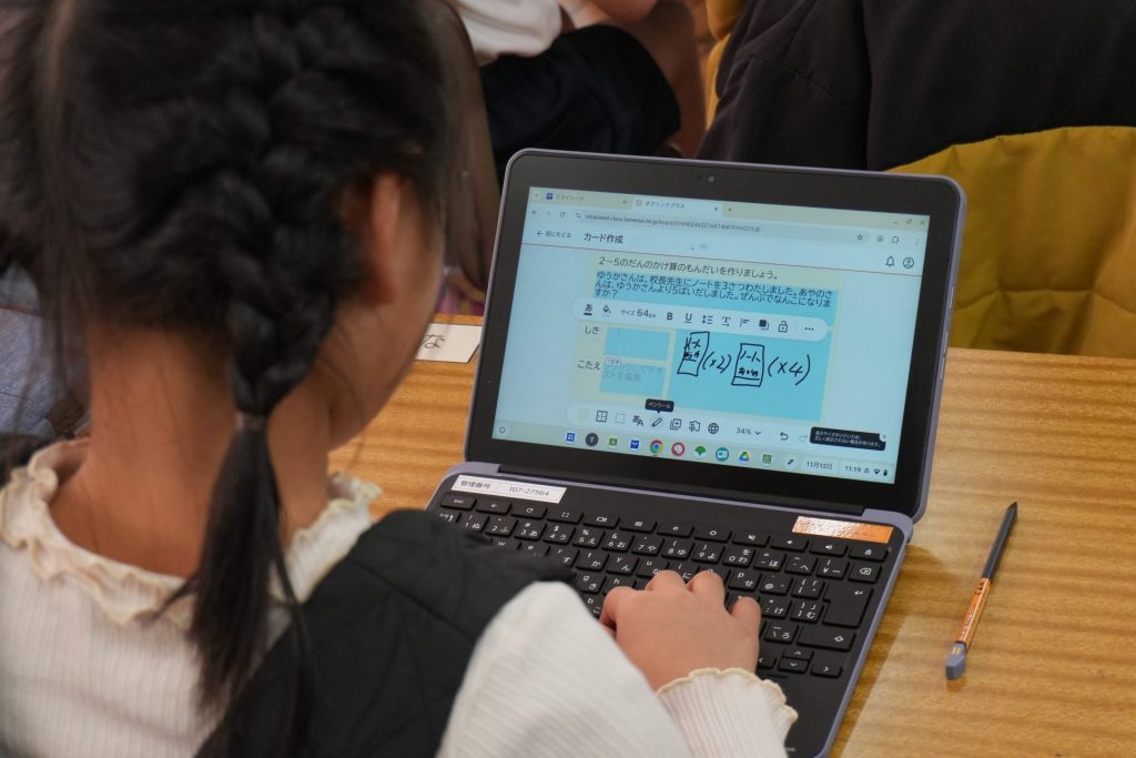練習問題が提出できたら、続いて各自がかけ算のオリジナル問題を作成してクラス全体に共有。そして友達の作った問題を実際に解いてみるという活動が行われました。まさに子供たちが自ら作り上げる授業です。