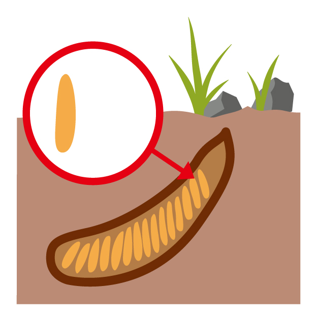また、おなじみのバッタたち、トノサマバッタやショウリョウバッタなどは、土の中にバナナのような曲がった形の卵をたくさん産み付けます。しかも、地面から5センチほどの深い場所に産み付けるため、自然環境で見つけるのはとても難しいです。カマキリと同様、春になると成虫に近い姿で生まれてきますよ。