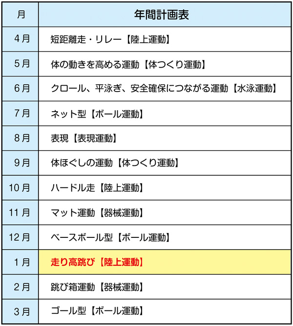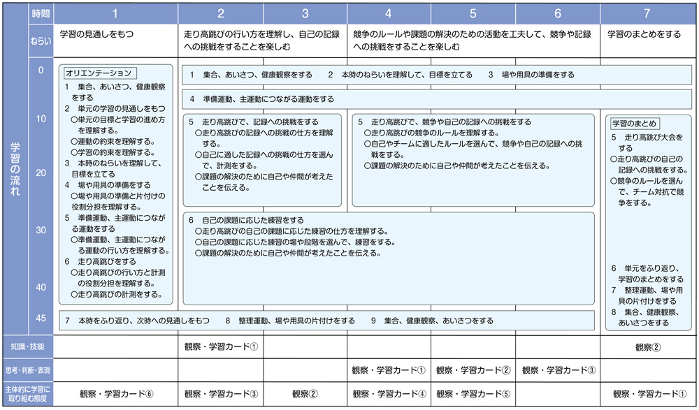 リズミカルな助走から踏み切って高く跳ぶことにより合理的で心地よい動きを身に付けるとともに、自己の課題の解決の仕方や記録への挑戦の仕方を工夫したり、仲間と高さを競い合ったりすることができるようにします。また、自己の能力に適した課題をもち、課題の解決に向けて、互いに学び合うことができるようにします。
