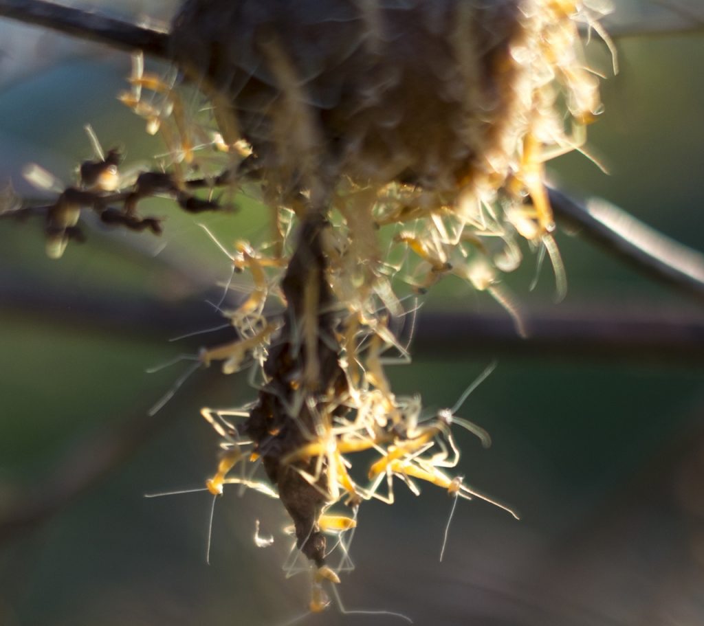 秋に産み落とされた卵は卵のうの中で越冬し、4月下旬以降、気温が20度ほどになった春の日に、何の前触れもなく一斉に孵化します。1つの卵のうの中には200個ほどの卵が入っており、小さなカマキリの姿をした幼虫がワラワラと這い出してくるのです。それは大変におもしろくも生命の神秘を感じさせる景色で、ぜひとも子どもたちに見せ経験させてあげたいものです。