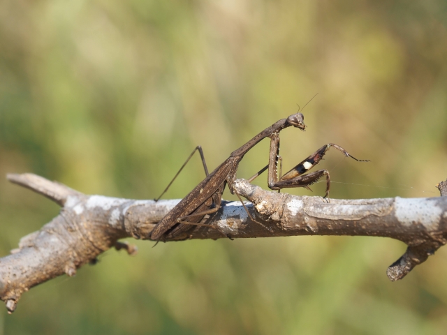 たんに「カマキリ」と呼ぶ場合、この種をさします。広く朝鮮半島から日本に分布しているためか、チョウセンカマキリという名前もついていますが、日本在来種です。成虫は7~8㎝です。体色は同じく緑型と褐色型があります。オオカマキリとよく似ており、見分けるのが難しいです。写真のように前足(カマ)の付け根の部分が、鮮やかなオレンジ色をしているのが一つの目印です。これに対してオオカマキリは、ここの部分が黄色です。また、威嚇など羽を広げてみせたときにも見分ける方法があります。オオカマキリの後羽には濃い紫色の部分がありますが、チョウセンカマキリは透明な後羽をしています。草地や河原、公園など人の生活圏でもよく見られます。