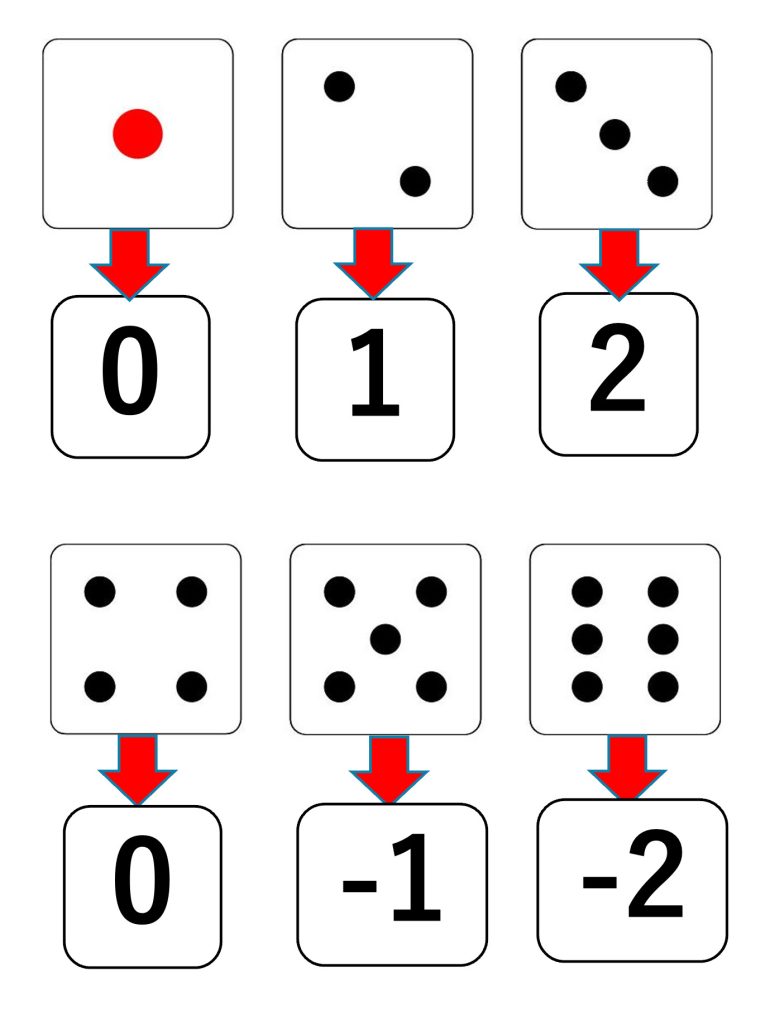 出た目が2のときは1マス、3のときは2マス進みます。1、4のときは0マスです(笑)。そして、5のときは1マス戻り、6のときは2マス戻ります。児童は、「4のときがなぜ0マス?」「5と6のときってマイナスなの!?」などとつぶやきますが、盛り上がって活動します。