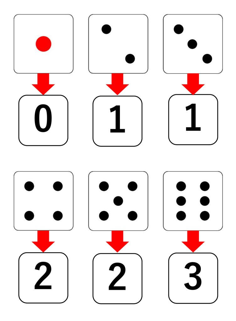 出た目が2、3のときは1マス、4、5のときは2マス、6のときは3マス進みます。そして、1のときは0マスです。