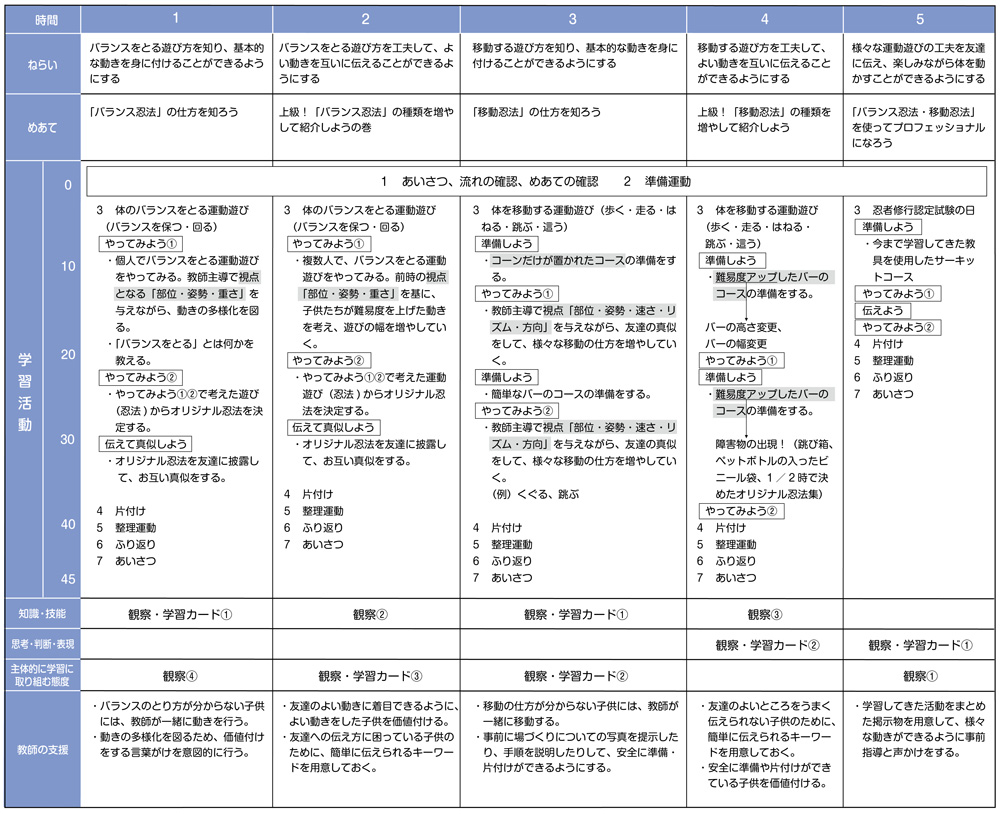 そこで、本指導アイデアでは遊びの世界に没入することをめざし、忍者になりきり、オリジナル忍法を披露するという学習課題を設定することで、子供たちが思わずバランスをとりながら運動遊びを楽しんだり、友達と遊びをつくる遊び方を工夫したりします。
