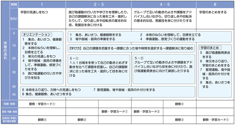 そこで、本指導アイデアでは、子供が自己の能力に適した技を選択して、自己やグループの課題を見付け、その課題解決の仕方を考えたり、練習の場を工夫・選択したりすることができる展開にしました。また、仲間と協力しながら運動に取り組み、個だけでなく仲間と一緒に身に付けた技を発表できるようにします。