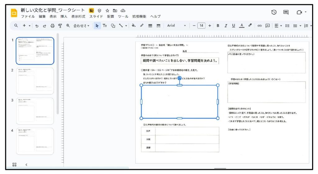 授業は、ワークシートの内容は同じまま、紙で取り組むか、Googleスライドを用いたデジタル形式で取り組むかを選べるようにデザインされていました。PCの操作に慣れている子供はデジタルを軸に学習を進め、書くことに安心感がある子供は手元の教科書や資料集などを手がかりにしながら学習を進めます。学び方の個人差を前提に、取組の入り口が複数用意されていました。