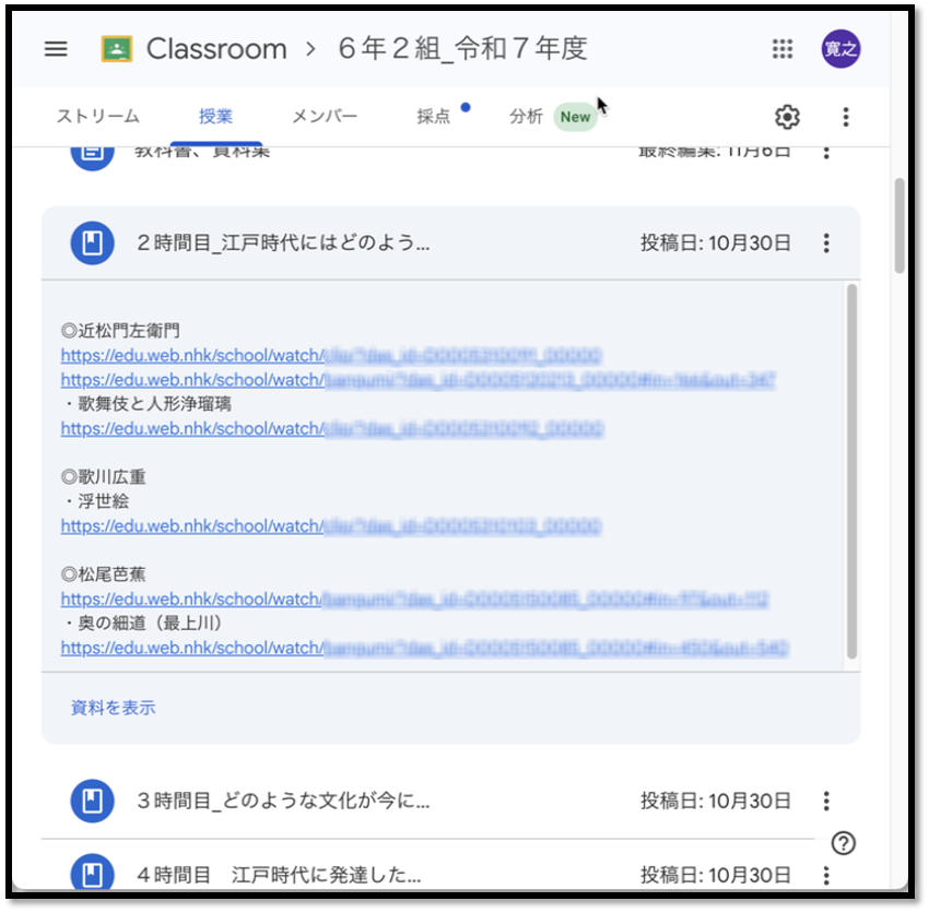 動画資料もURLとして整理され、Google Classroom上に時程ごとに配置されているなど、「デジタルが得意な子なら1台で完結できる」環境が整えられています。