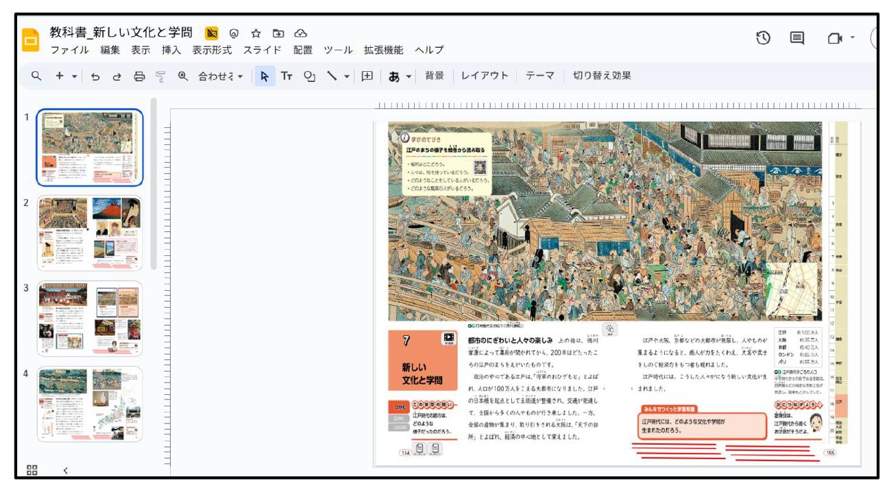 デジタル形式を選んだ子供に対しては、教科書や資料集のページをスライド化して提示することで、必要な情報にすぐアクセスできるようになっていました。