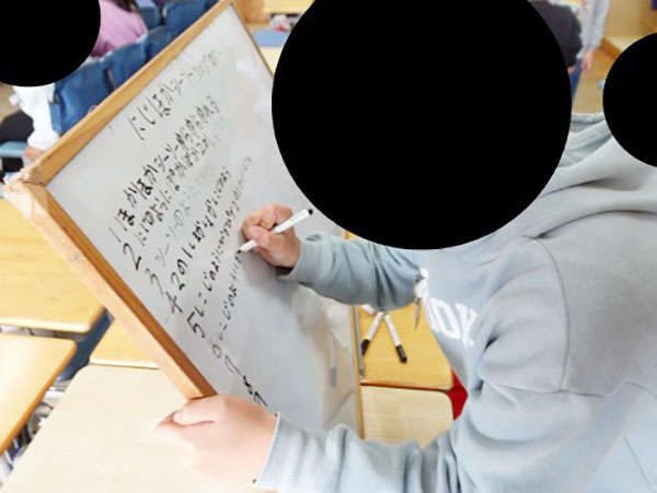 曲づくりの主役は子どもたちです。歌詞づくりの段階では、ホワイトボードや模造紙などを用いて、あえてアナログな話合い活動を行うのも効果的です。良い歌詞かどうかよりも、友達と顔と膝を付き合わせ、お互いの「願い」を聴き合うことに大きな価値があると考えるからです。